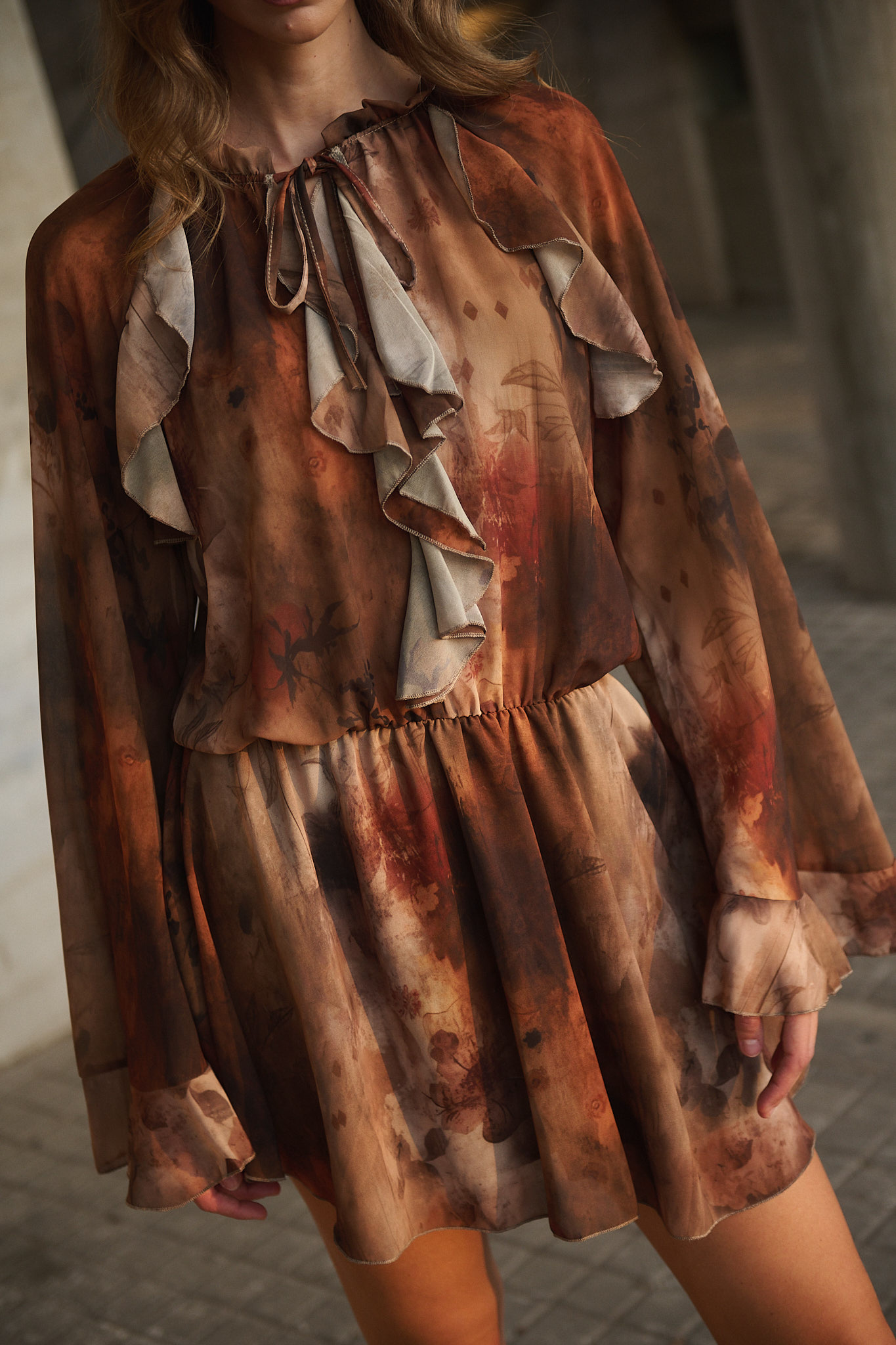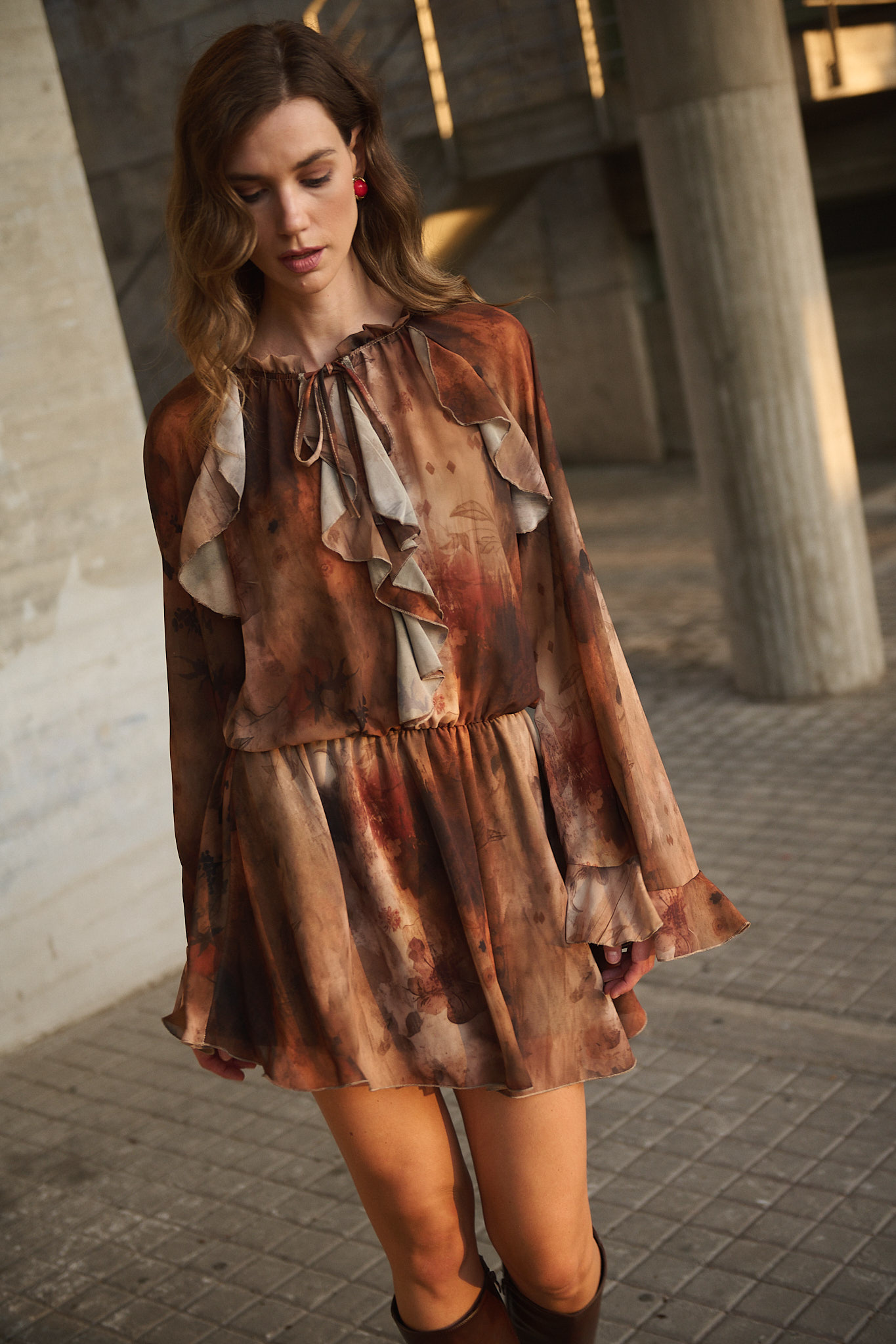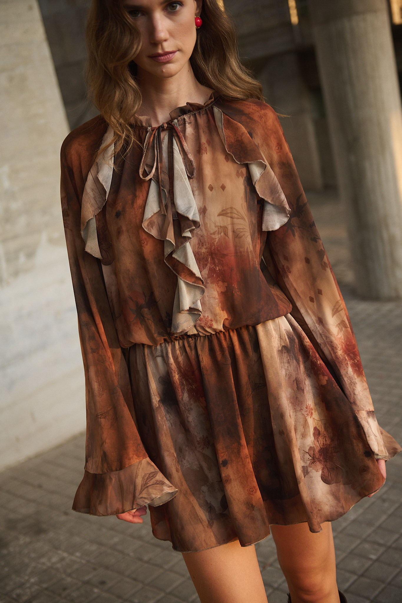 Φόρεμα Mini σε Γήινο Εμπριμέ με Βολάν “Autumn Lily”