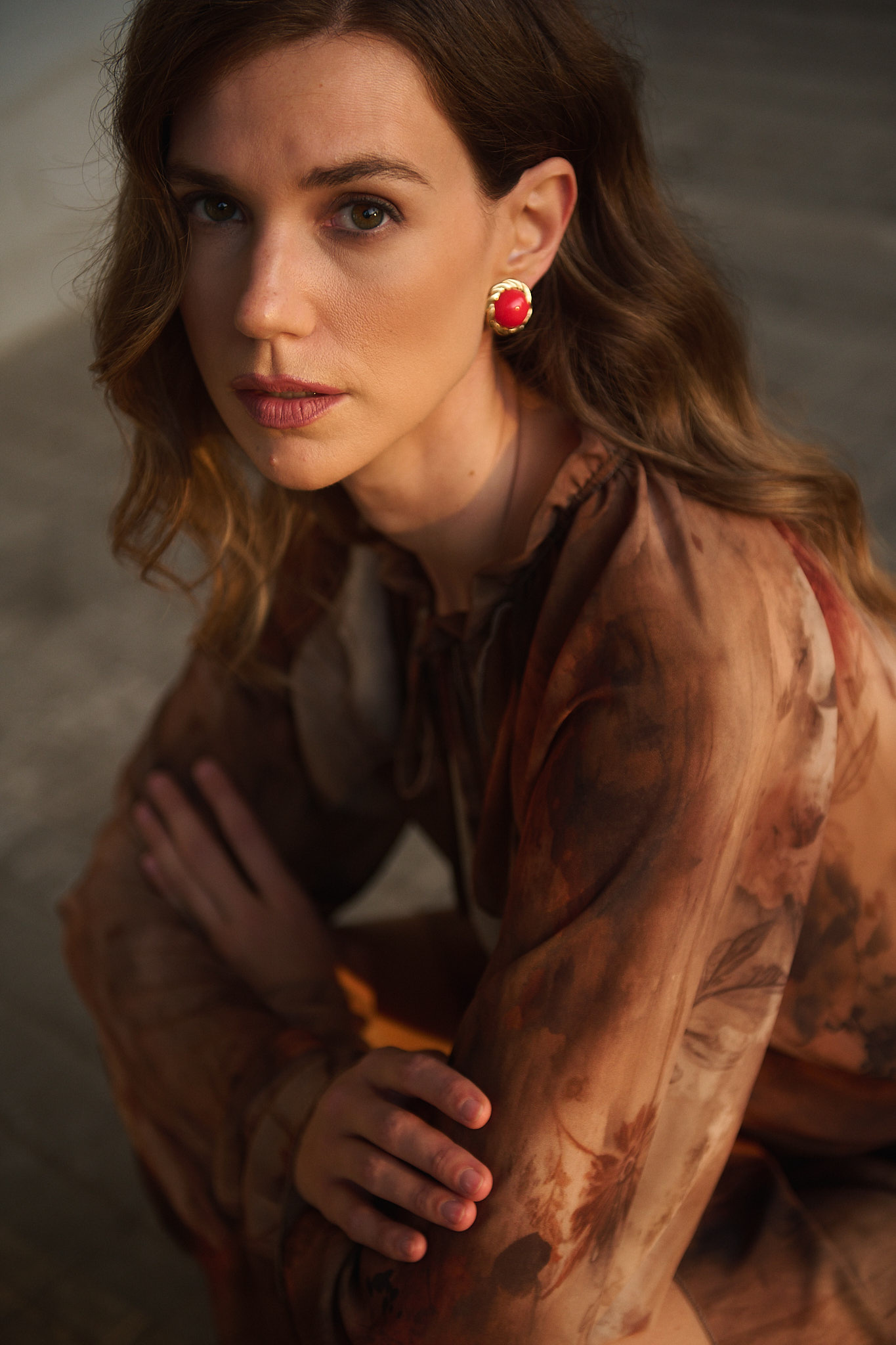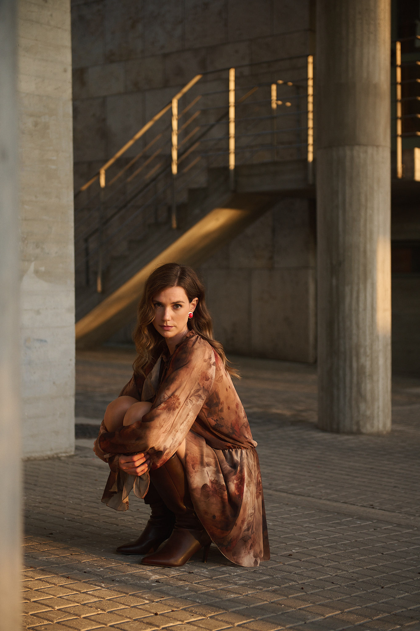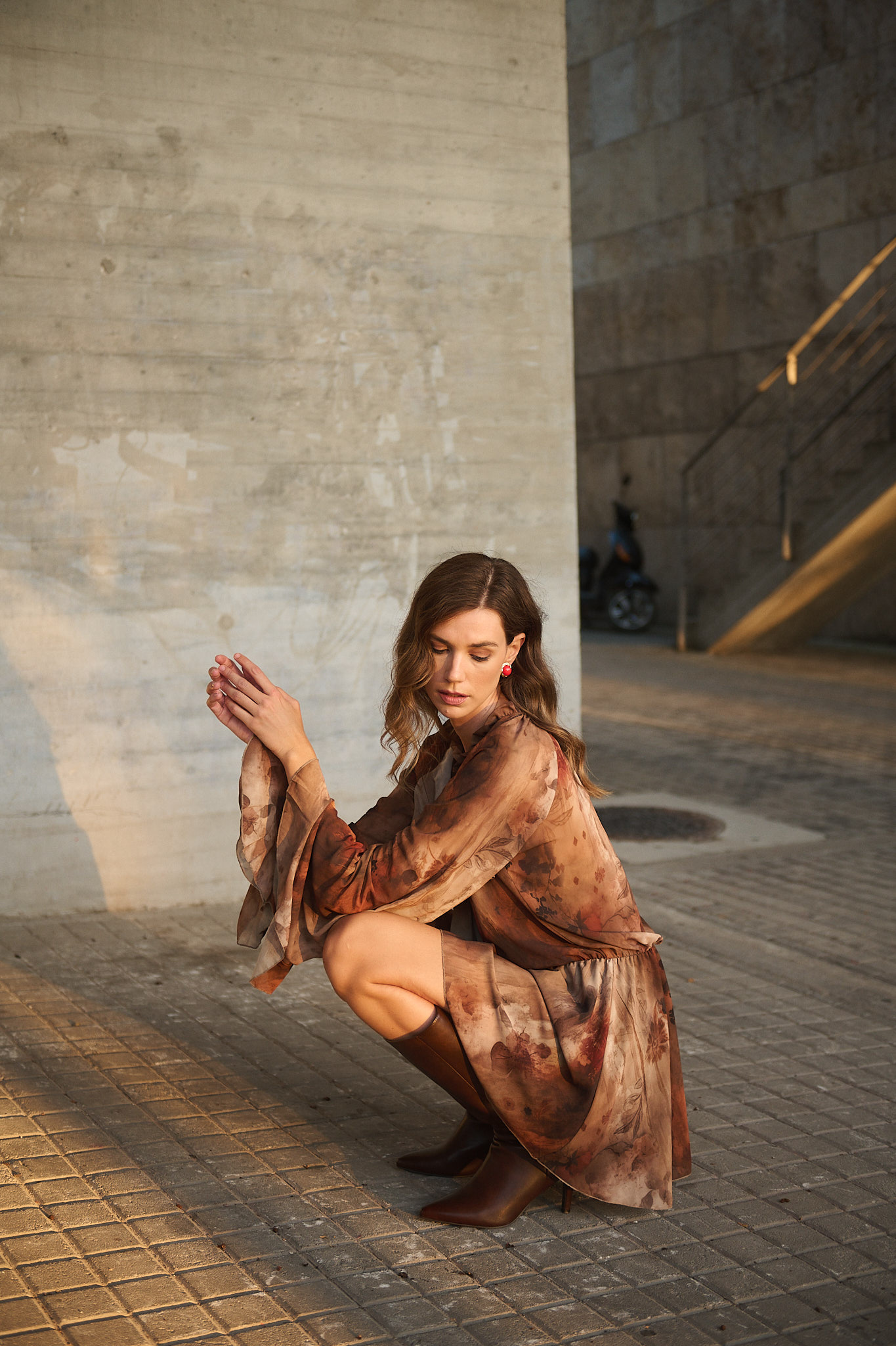 Αγκαλιάζει το φθινοπωρινό φως σαν παλέτα από φύλλα, χώμα και καμένο κόκκινο. Το φόρεμα “Autumn Lily” είναι ένας ύμνος στην κίνηση, με αέρινα μανίκια και ρομαντικά βολάν που πλαισιώνουν το μπούστο. Η διακριτική λάμψη του υφάσματος και το απαλό του πέσιμο το καθιστούν ιδανικό για all-day εμφανίσεις με καλλιτεχνική αύρα.