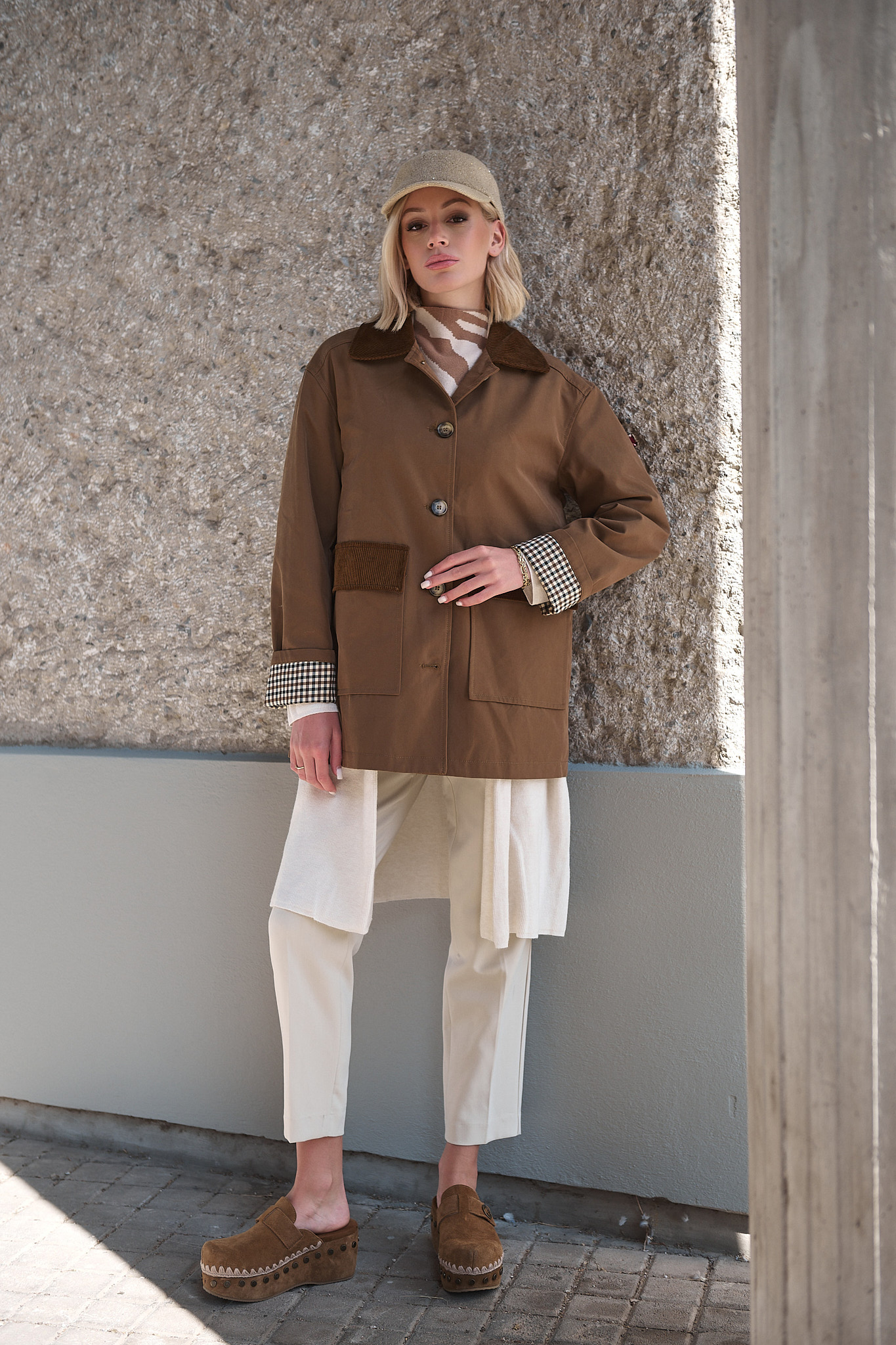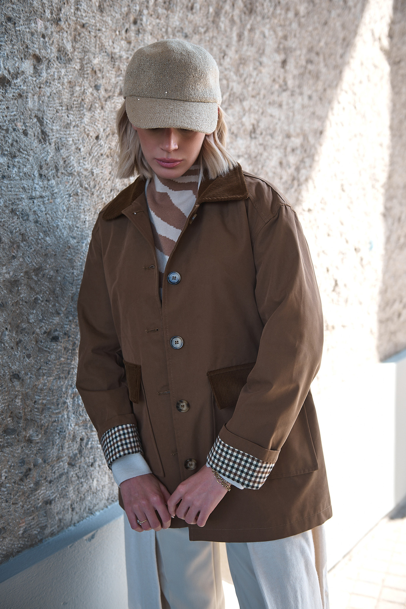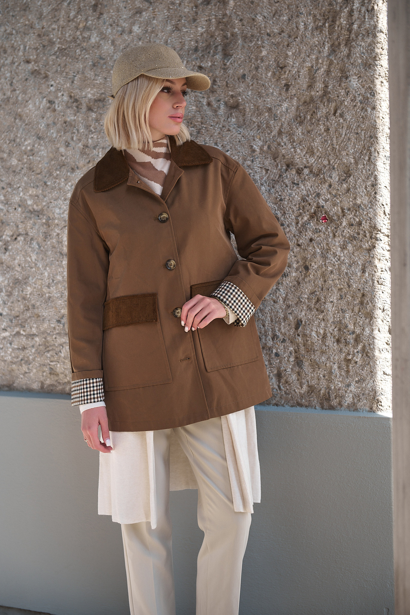 Με έμπνευση από το φως του φθινοπώρου και τη ζεστασιά της γης, η καμπαρντίνα “Wren” φέρνει μαζί τον κλασικό αγγλικό αέρα με μια ανεπιτήδευτη αστική κομψότητα. Το καμηλό χρώμα της αναδεικνύεται μέσα από τις λεπτομέρειες σε κοτλέ και καρό, δημιουργώντας ένα κομμάτι που μεταβαίνει άψογα από το πρωινό φως στο απογευματινό σούρουπο.