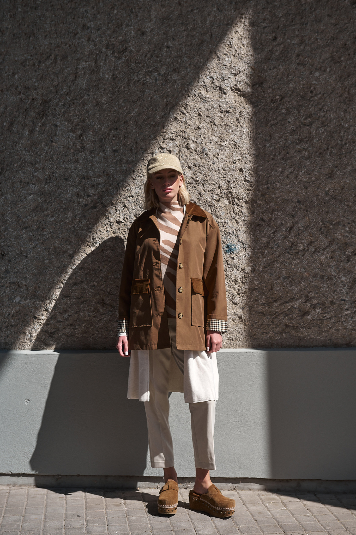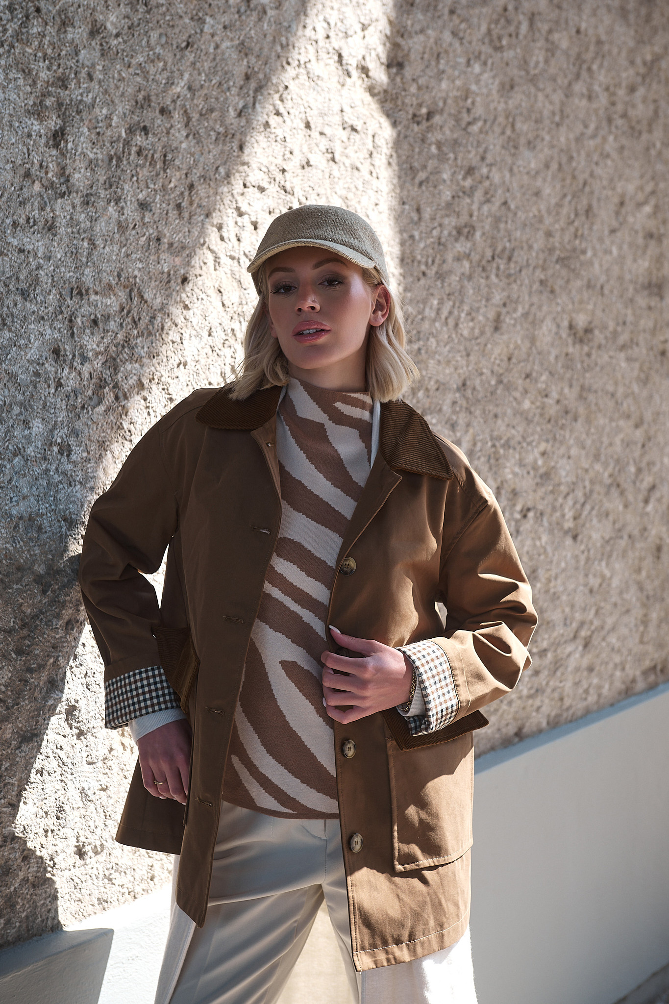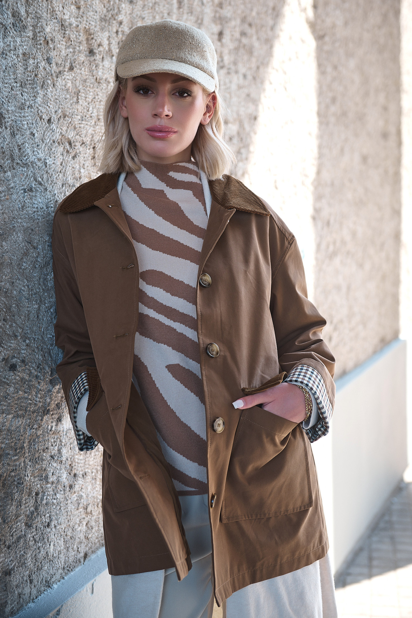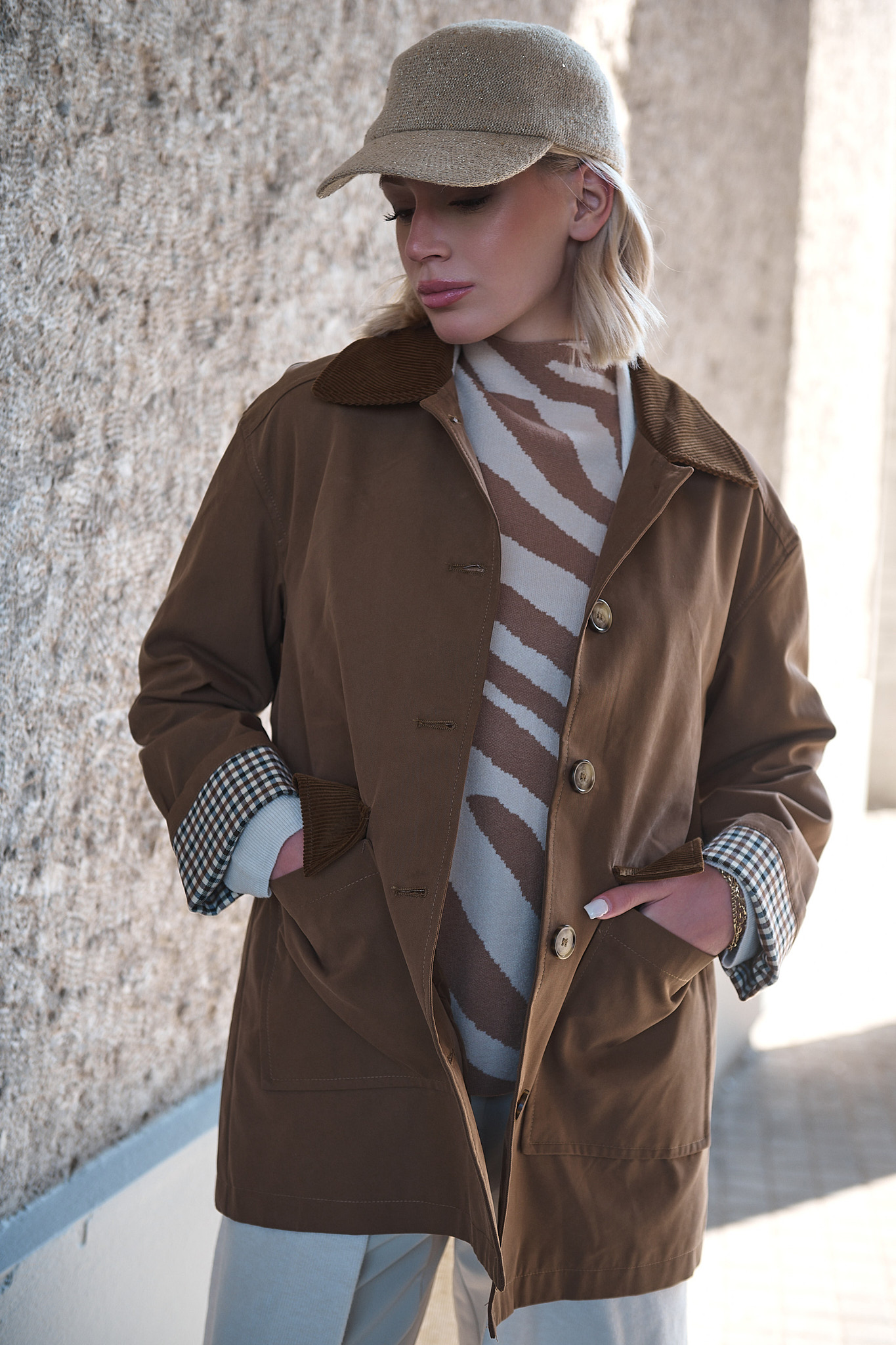 Με έμπνευση από το φως του φθινοπώρου και τη ζεστασιά της γης, η καμπαρντίνα “Wren” φέρνει μαζί τον κλασικό αγγλικό αέρα με μια ανεπιτήδευτη αστική κομψότητα. Το καμηλό χρώμα της αναδεικνύεται μέσα από τις λεπτομέρειες σε κοτλέ και καρό, δημιουργώντας ένα κομμάτι που μεταβαίνει άψογα από το πρωινό φως στο απογευματινό σούρουπο.