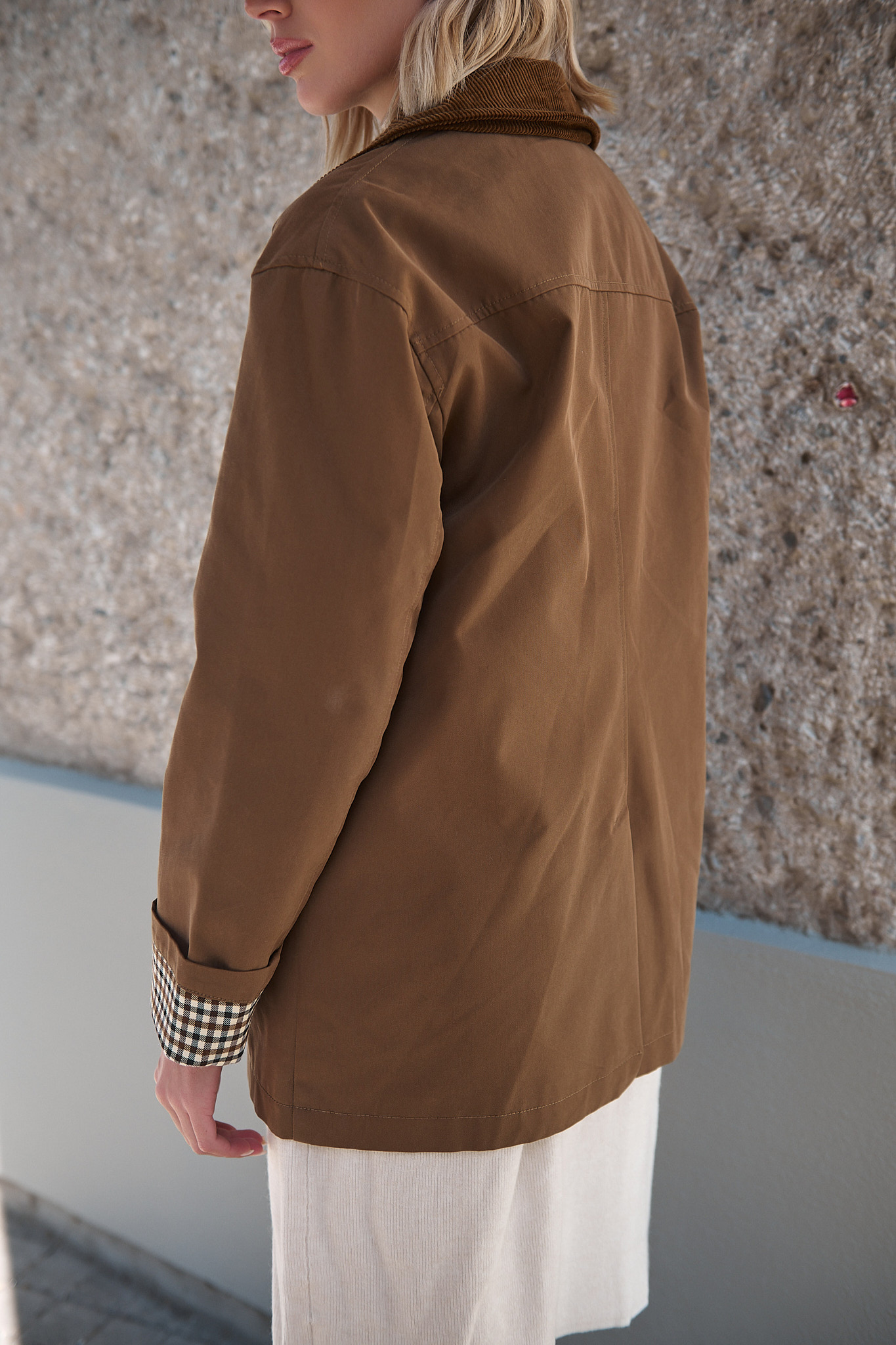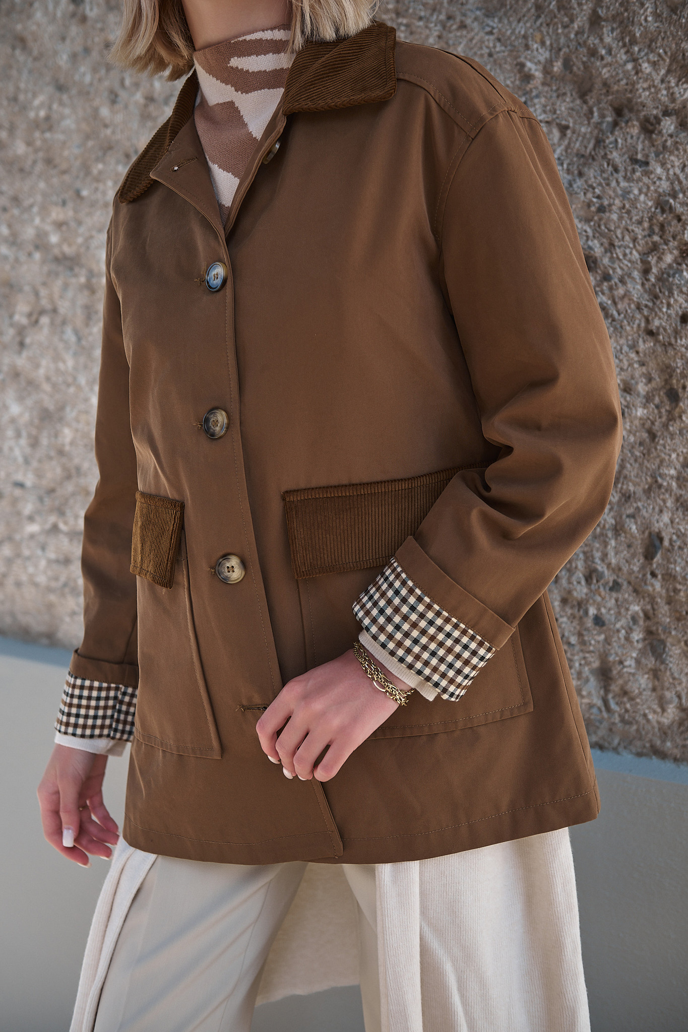 • Λεπτομέρειες: Γιακάς και τσέπες με υφή κοτλέ, γυριστά μανίκια με καρό ρεβέρ