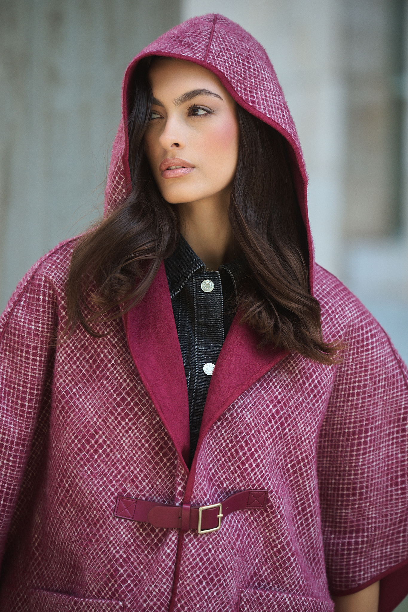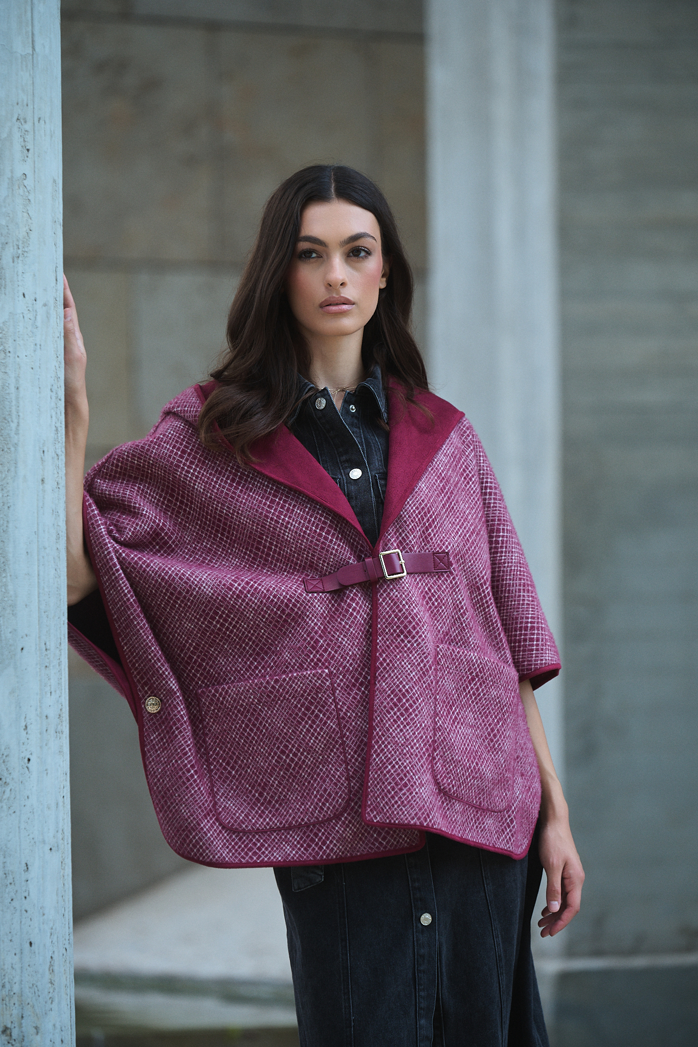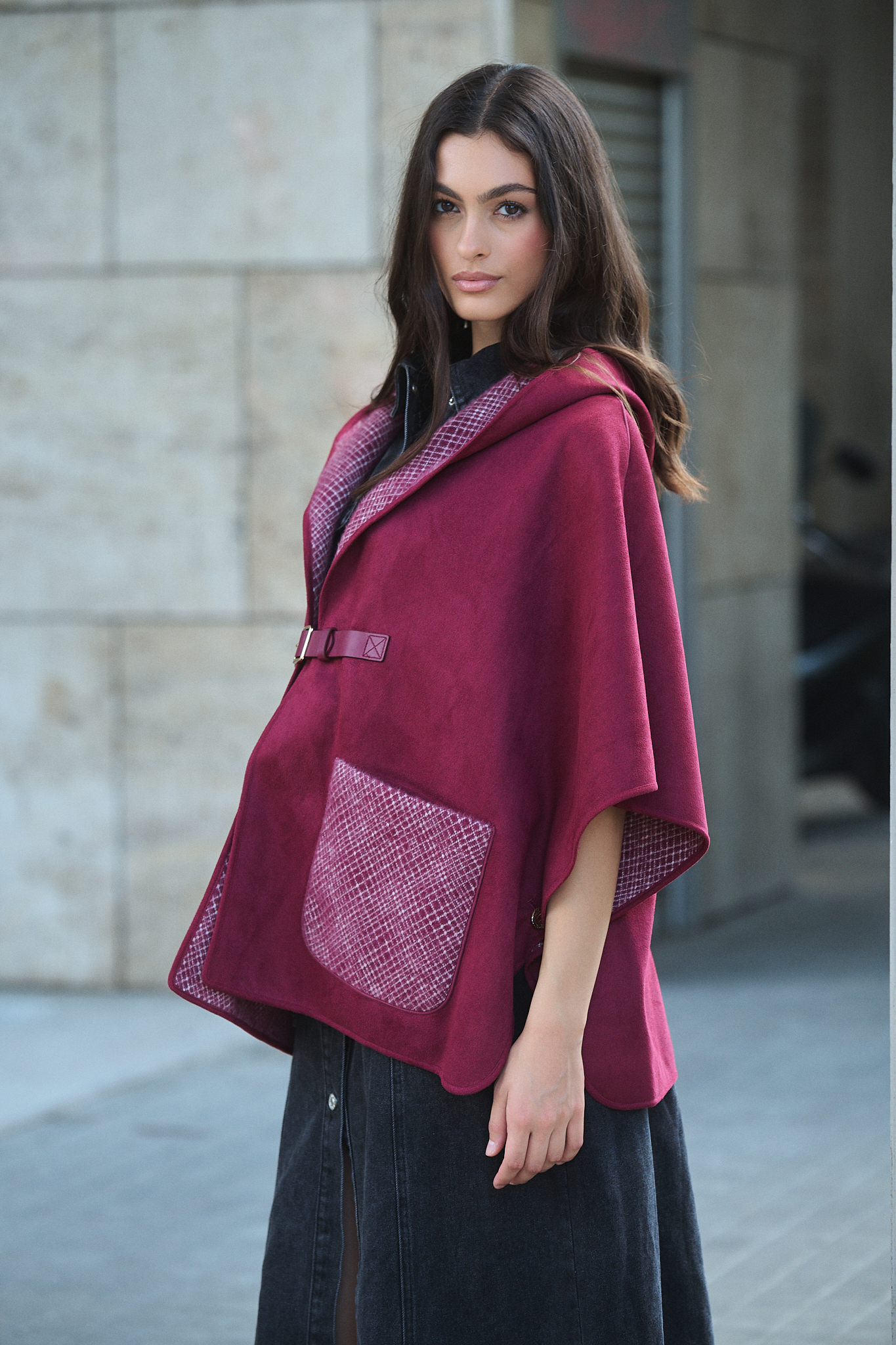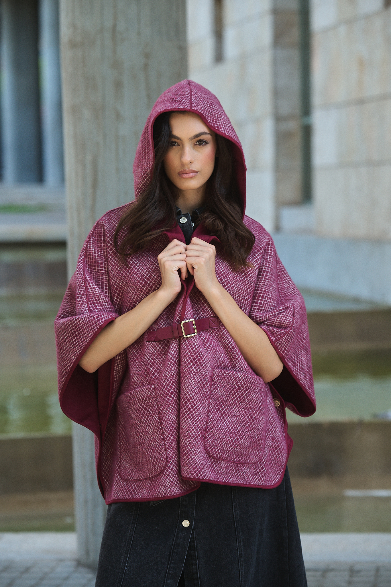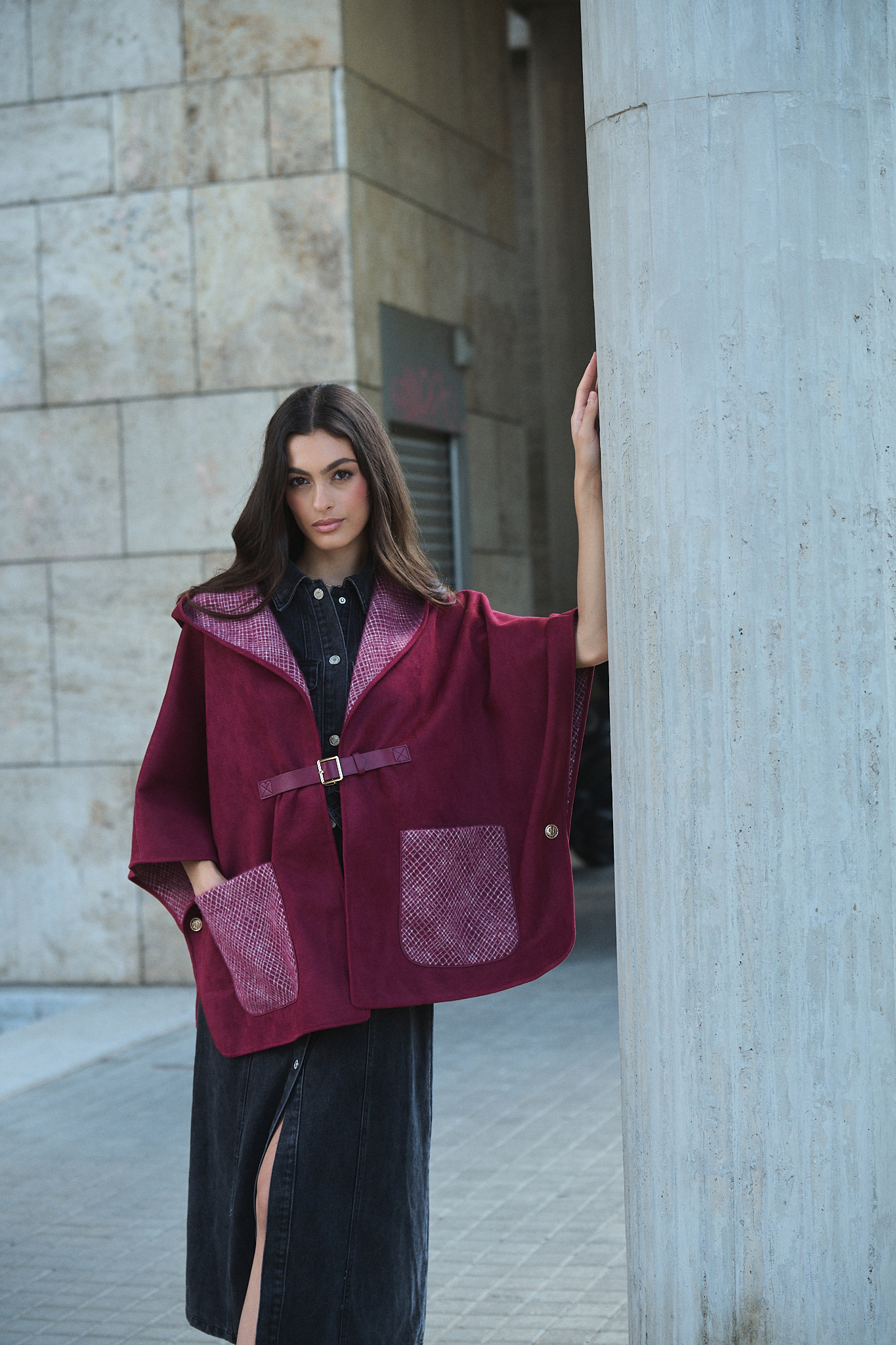 Μια κάπα που αγκαλιάζει τη σύγχρονη αισθητική με cozy φινέτσα. Η μπορντό double-face κάπα με κουκούλα και δερμάτινη ζώνη συνδυάζει την υφή του σουέτ με ένα διακριτικό καρό μοτίβο σε αποχρώσεις του κόκκινου. Oversized γραμμή με φαρδιά μανίκια και statement μεγάλες τσέπες, για layering που ξεχωρίζει.