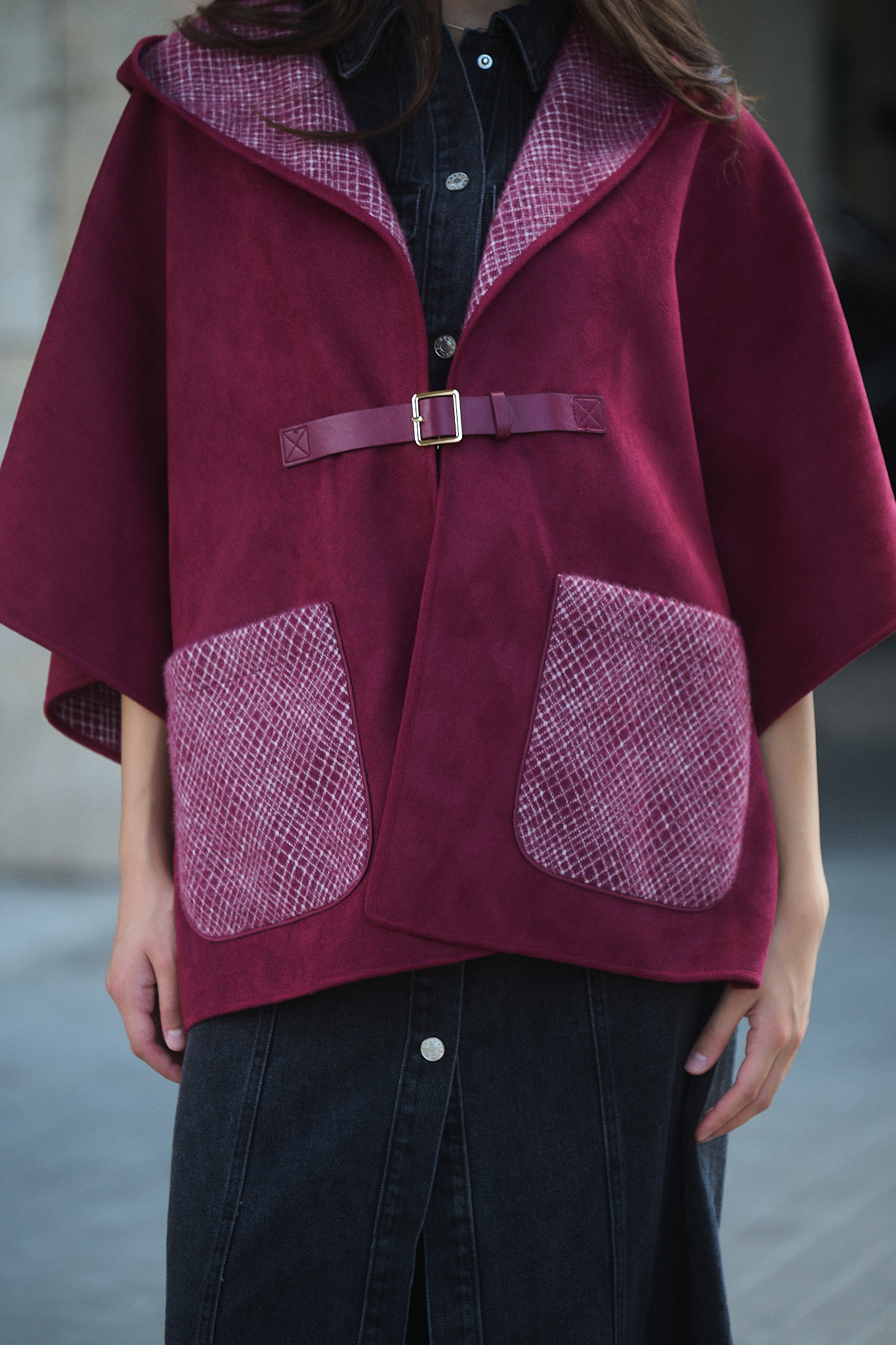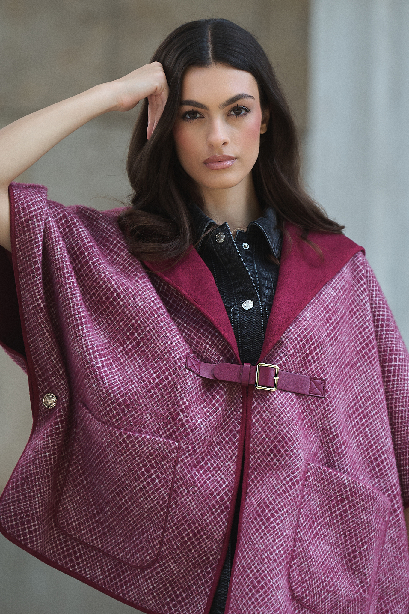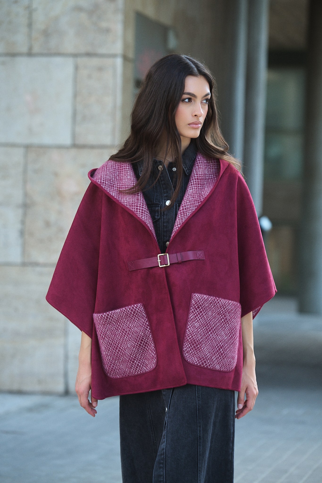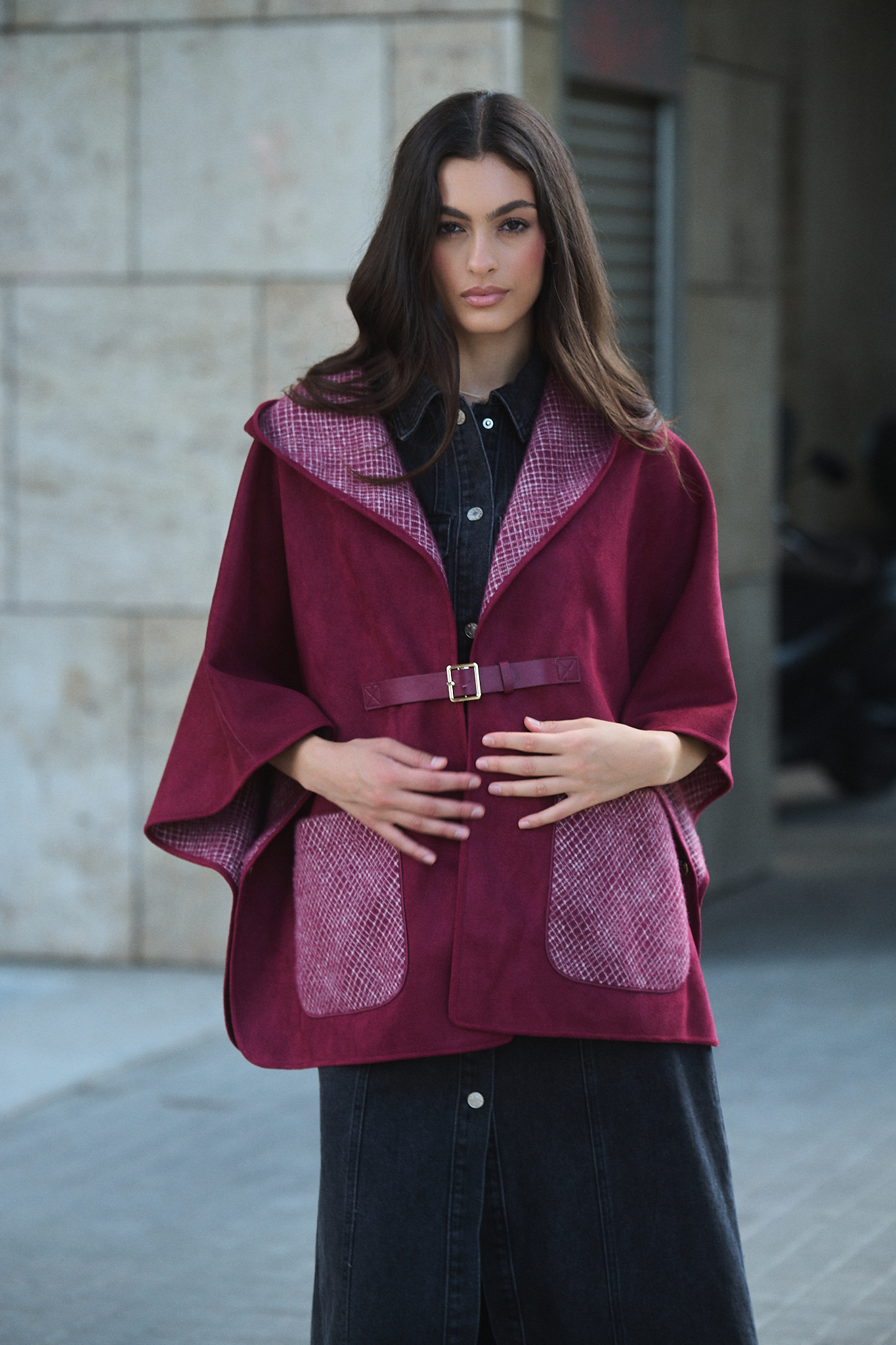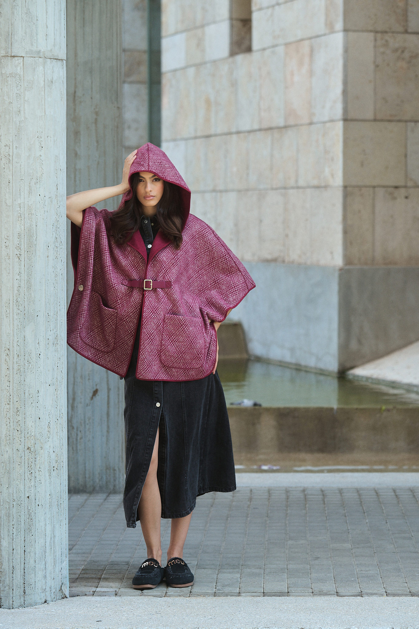 Μια κάπα που αγκαλιάζει τη σύγχρονη αισθητική με cozy φινέτσα. Η μπορντό double-face κάπα με κουκούλα και δερμάτινη ζώνη συνδυάζει την υφή του σουέτ με ένα διακριτικό καρό μοτίβο σε αποχρώσεις του κόκκινου. Oversized γραμμή με φαρδιά μανίκια και statement μεγάλες τσέπες, για layering που ξεχωρίζει.