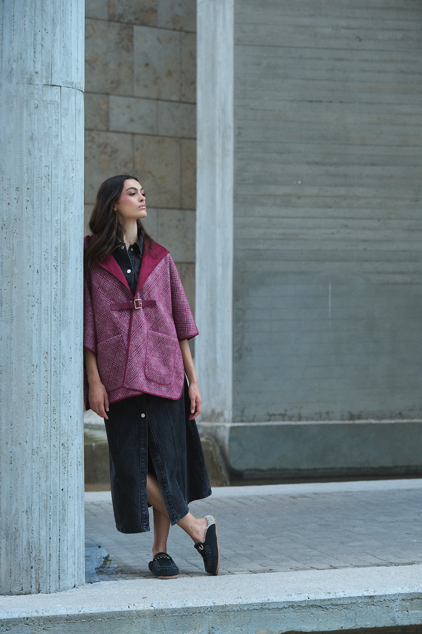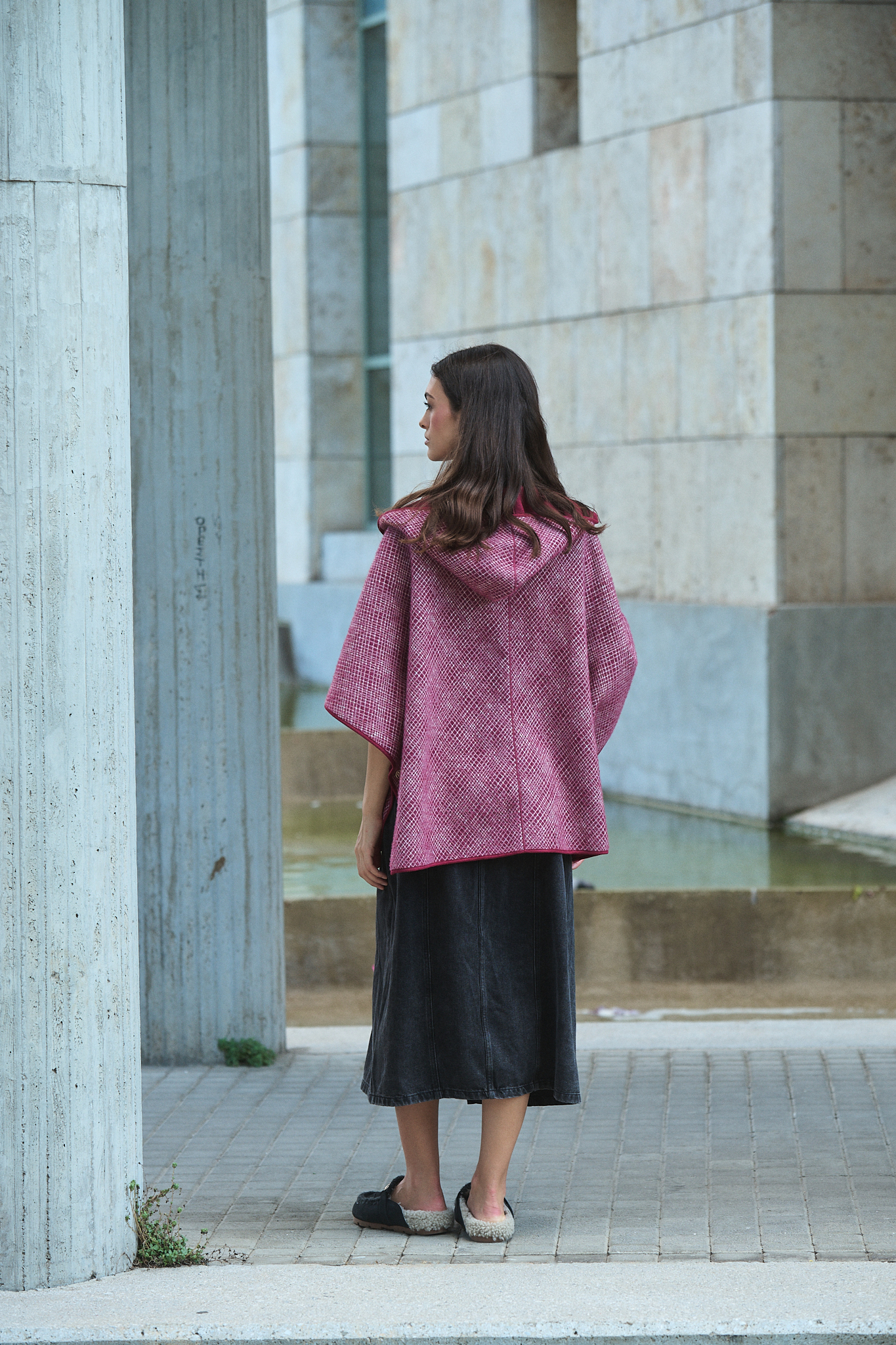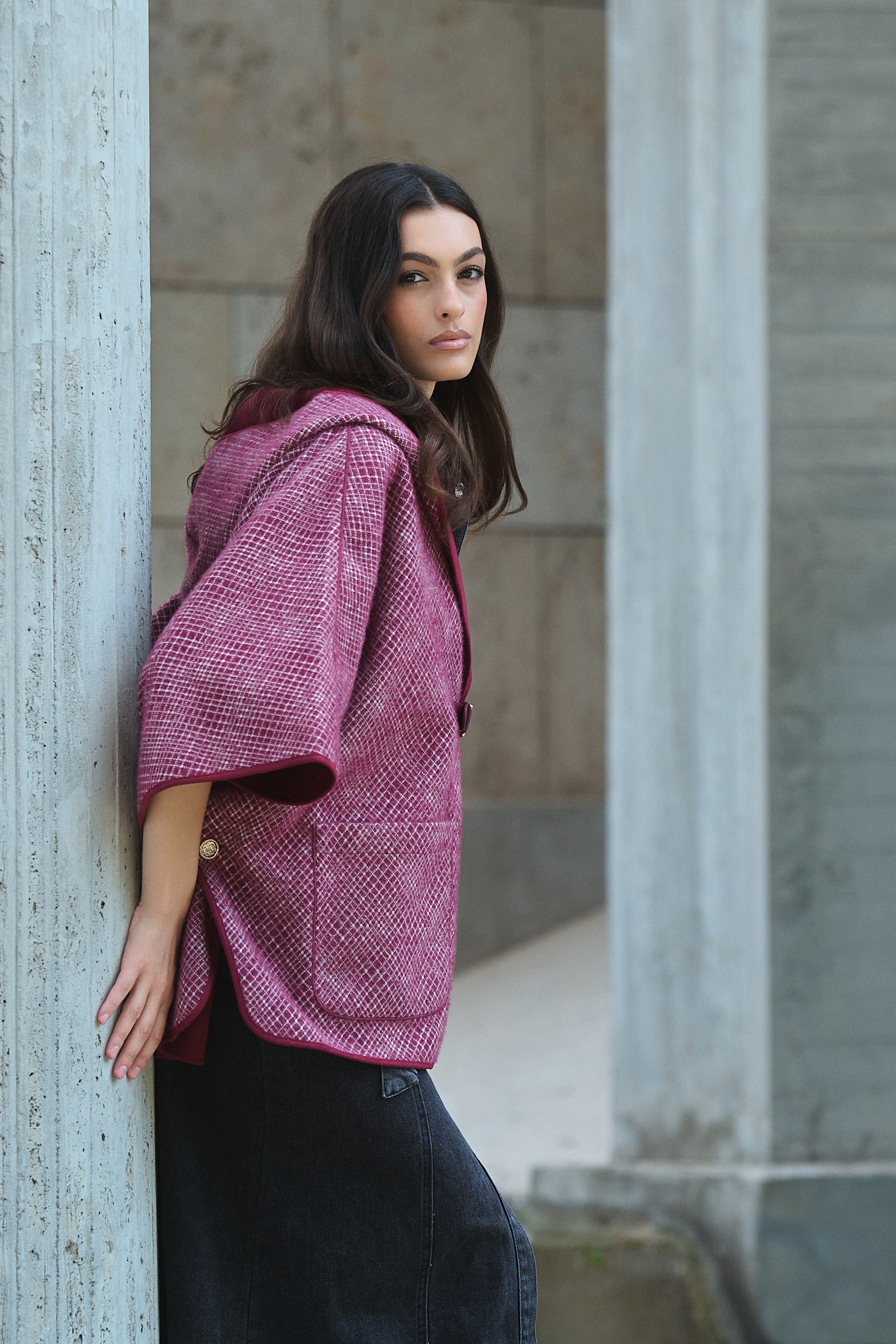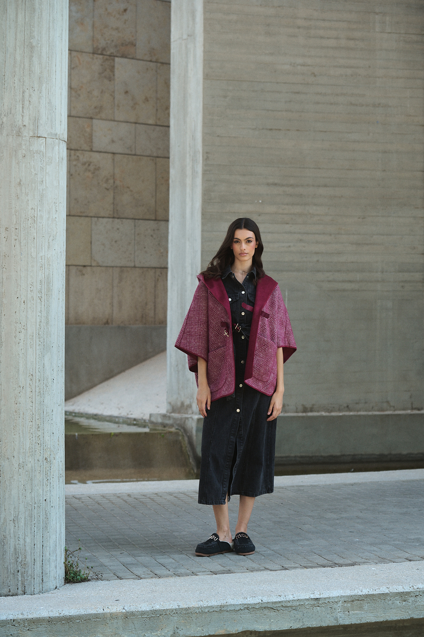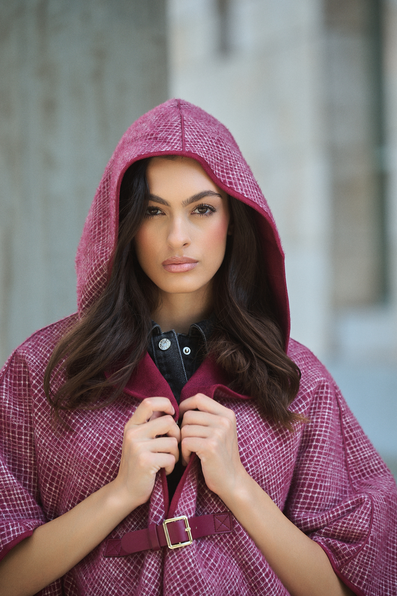 Μια κάπα που αγκαλιάζει τη σύγχρονη αισθητική με cozy φινέτσα. Η μπορντό double-face κάπα με κουκούλα και δερμάτινη ζώνη συνδυάζει την υφή του σουέτ με ένα διακριτικό καρό μοτίβο σε αποχρώσεις του κόκκινου. Oversized γραμμή με φαρδιά μανίκια και statement μεγάλες τσέπες, για layering που ξεχωρίζει.