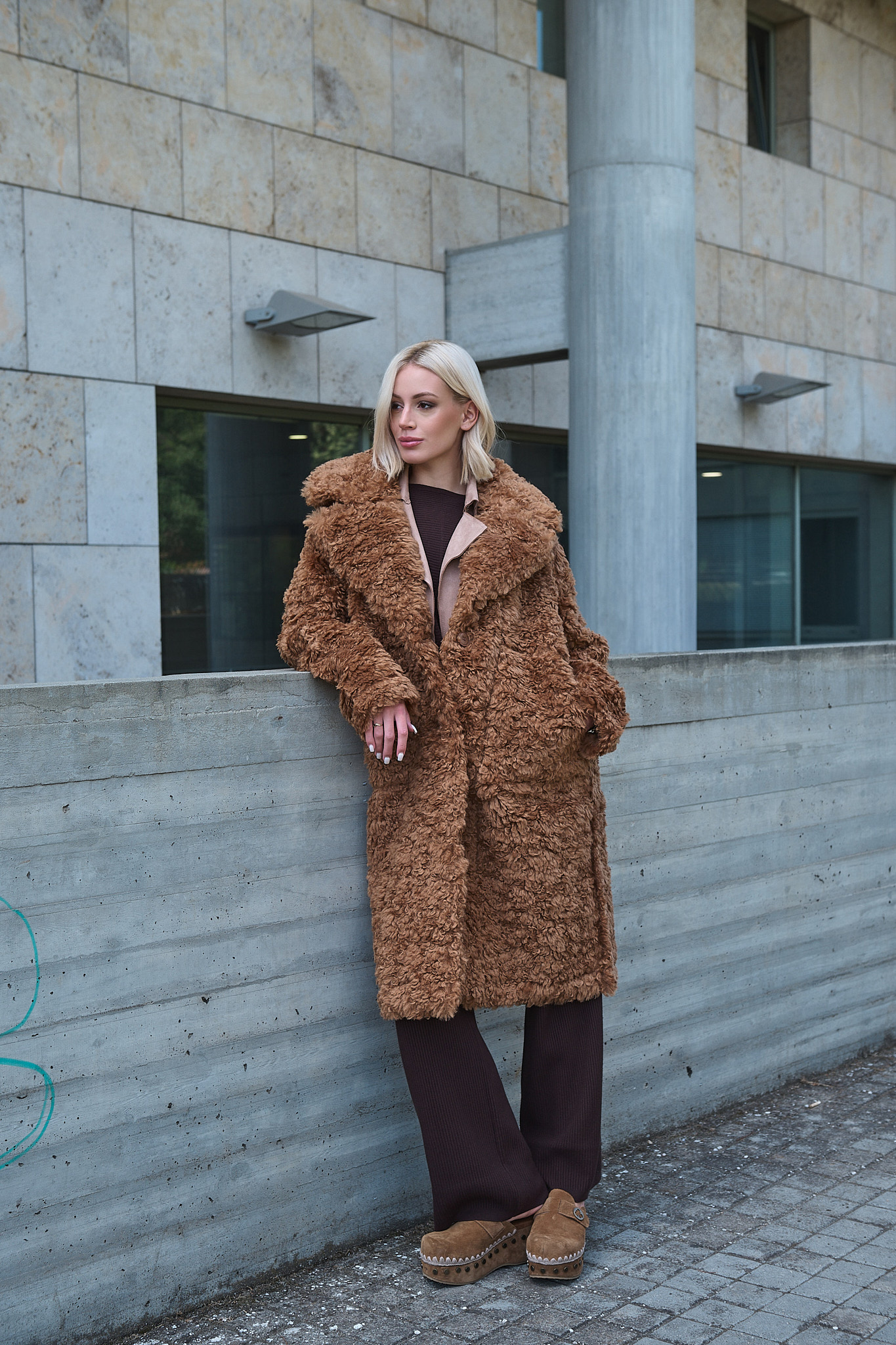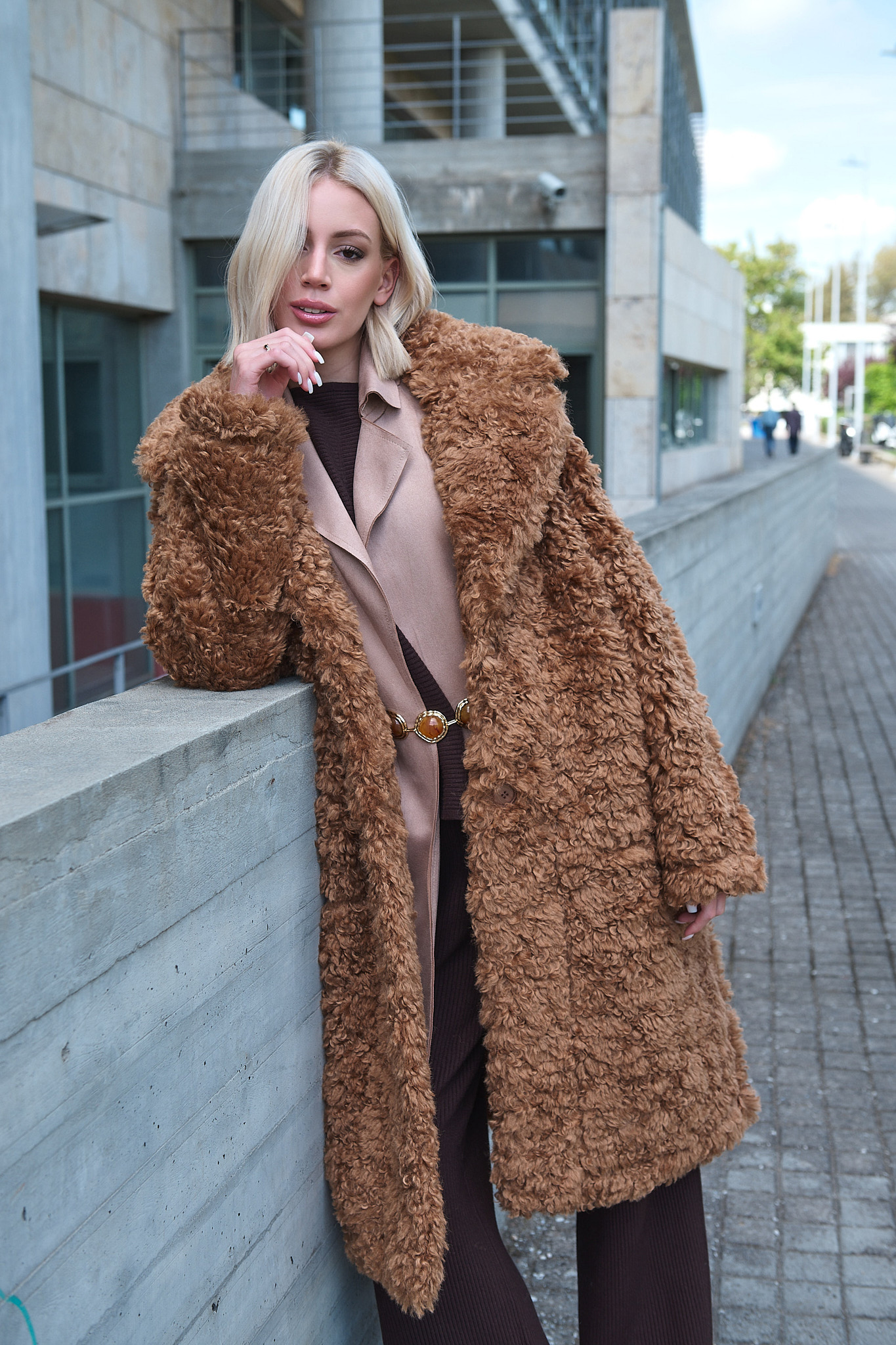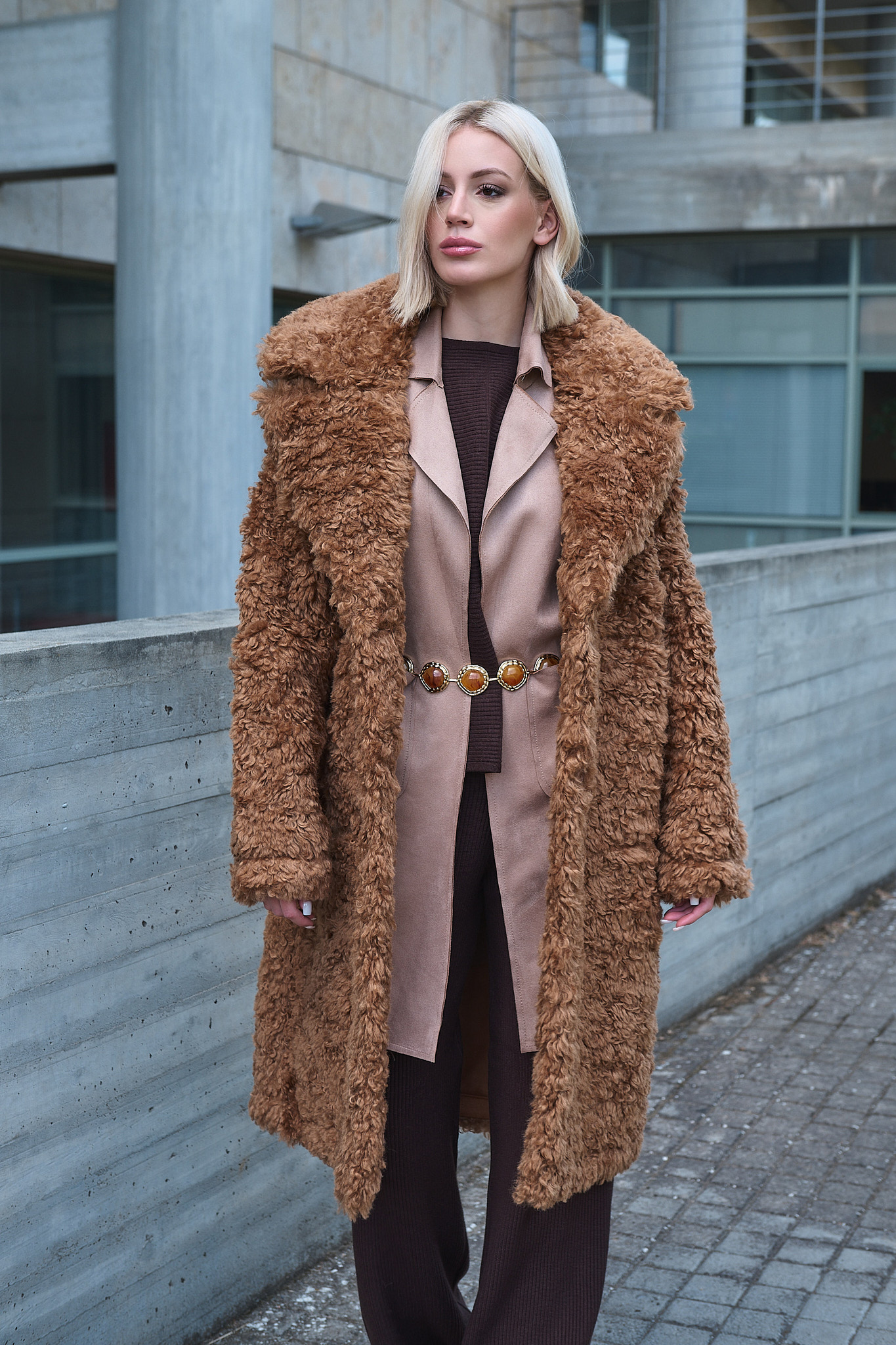 Ζεστό, πολυτελές και απόλυτα αγκαλιαστικό, το “Maranta” είναι το παλτό που κάνει κάθε χειμερινό πρωινό να μοιάζει με αγκαλιά. Η αφράτη, curly υφή της faux γούνας του χαρίζει πλούσιο όγκο και αίσθηση πολυτέλειας, ενώ η πλούσια καραμελένια απόχρωση φωτίζει μοναδικά κάθε τόνο δέρματος.