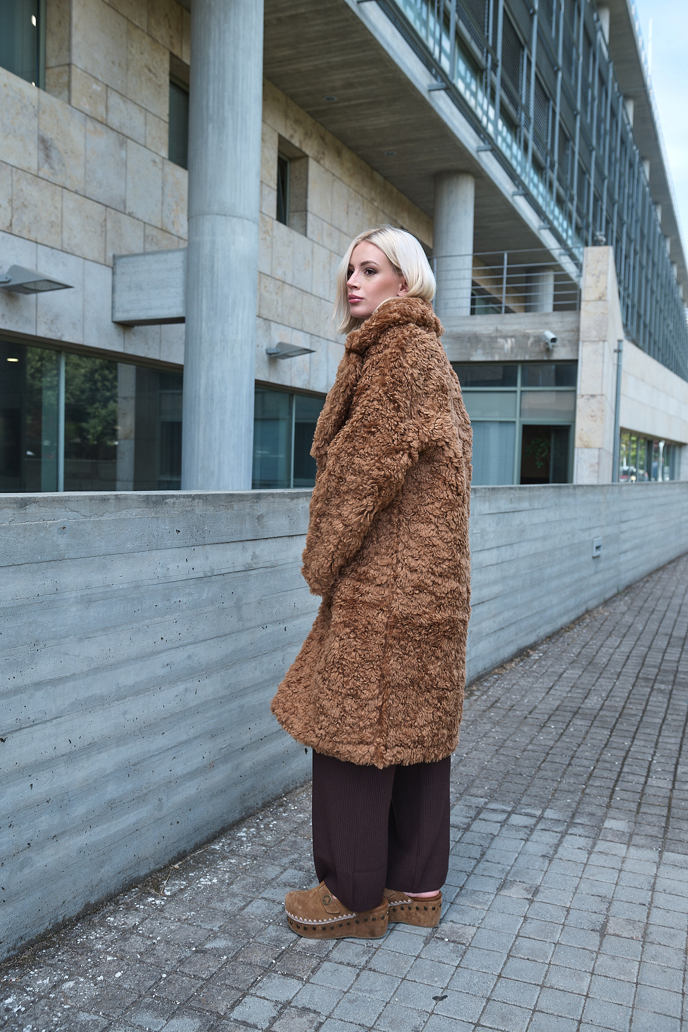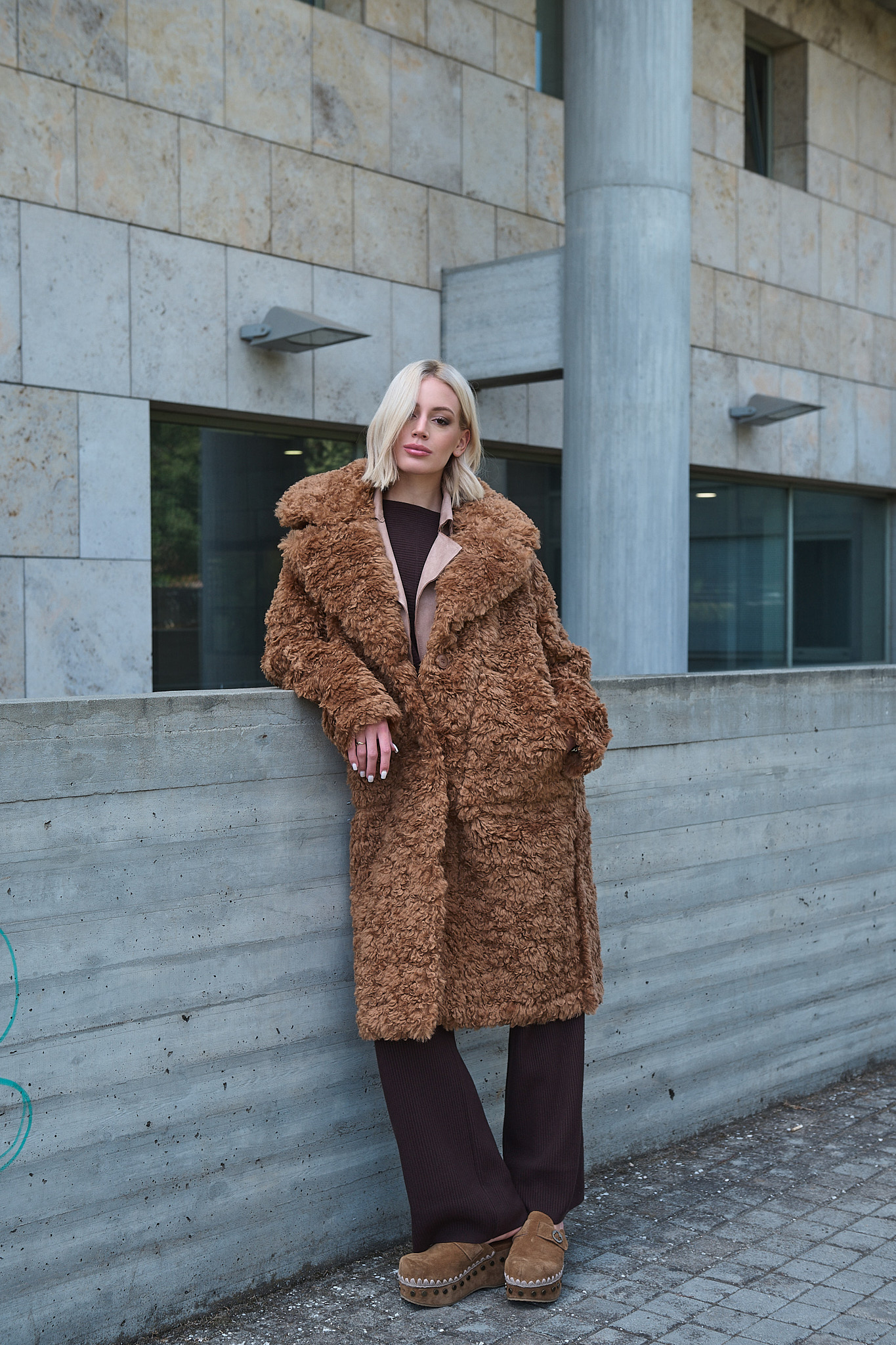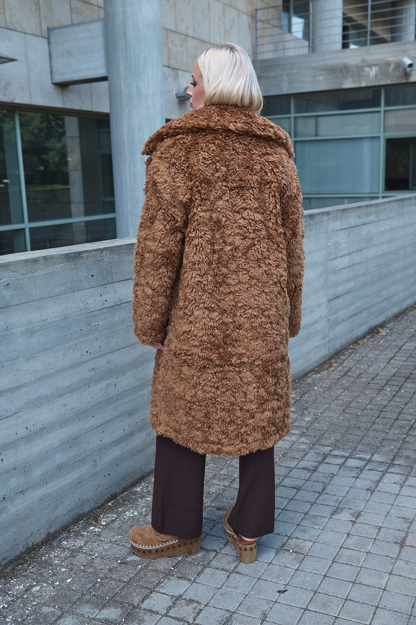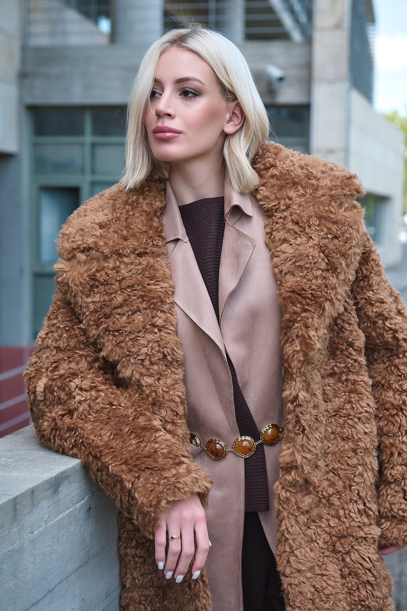 Ζεστό, πολυτελές και απόλυτα αγκαλιαστικό, το “Maranta” είναι το παλτό που κάνει κάθε χειμερινό πρωινό να μοιάζει με αγκαλιά. Η αφράτη, curly υφή της faux γούνας του χαρίζει πλούσιο όγκο και αίσθηση πολυτέλειας, ενώ η πλούσια καραμελένια απόχρωση φωτίζει μοναδικά κάθε τόνο δέρματος.