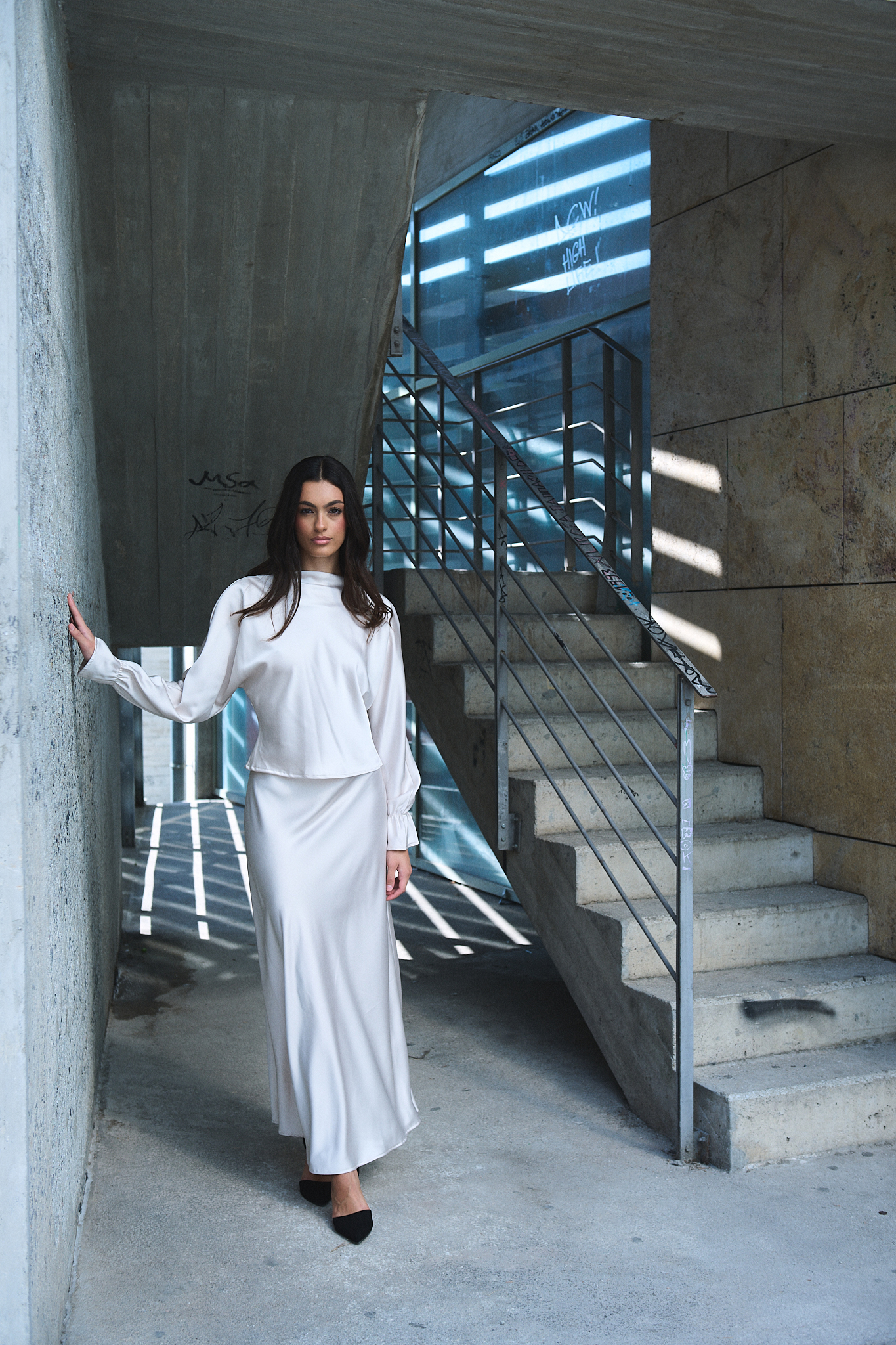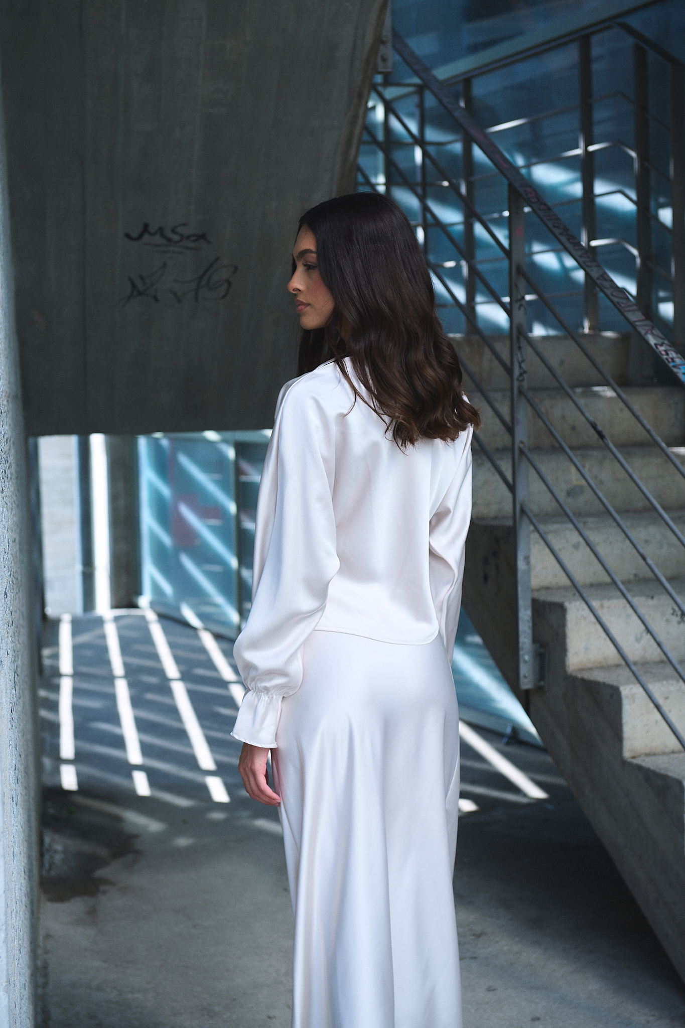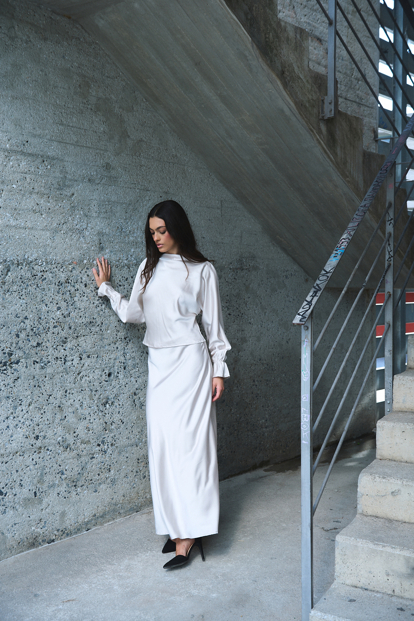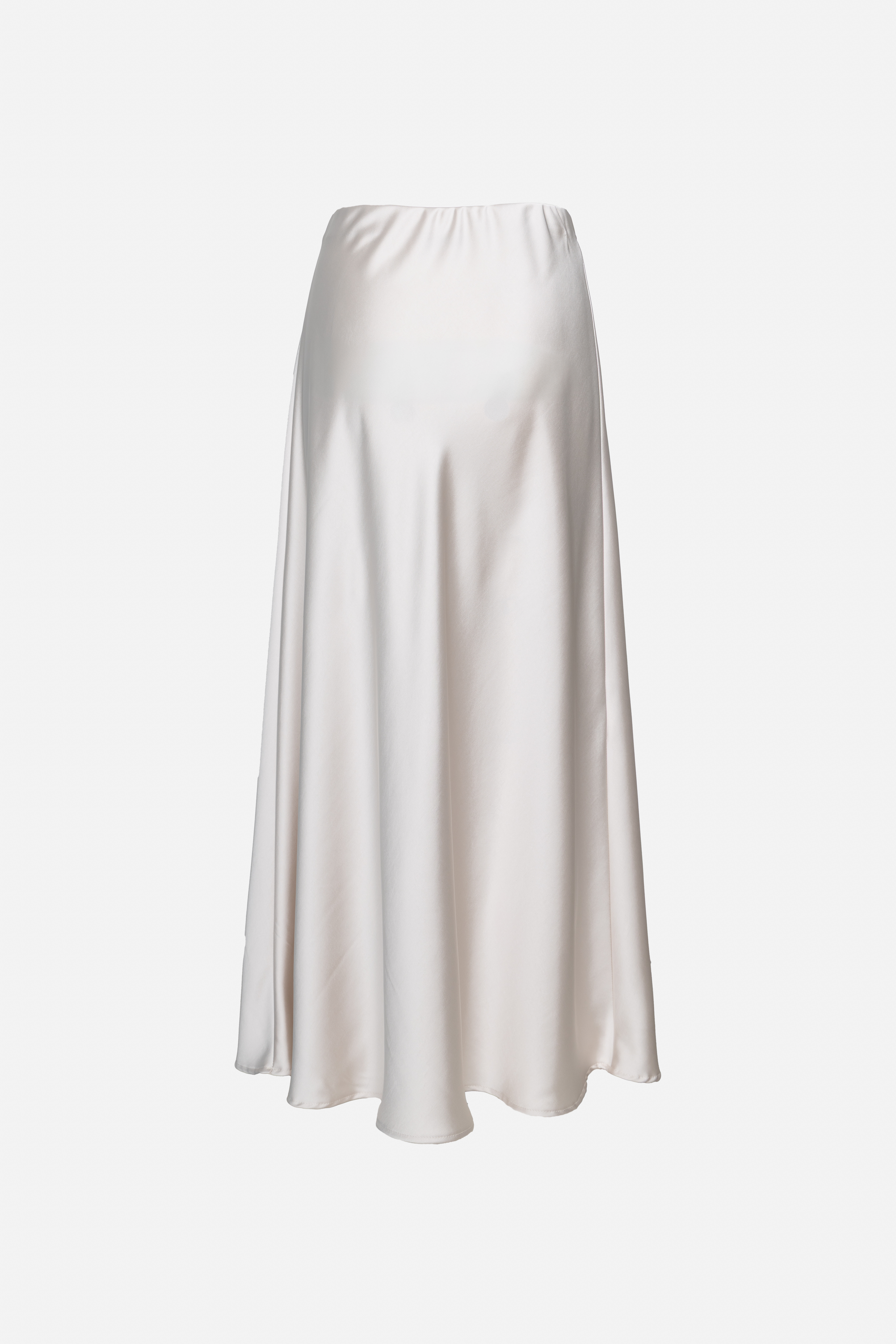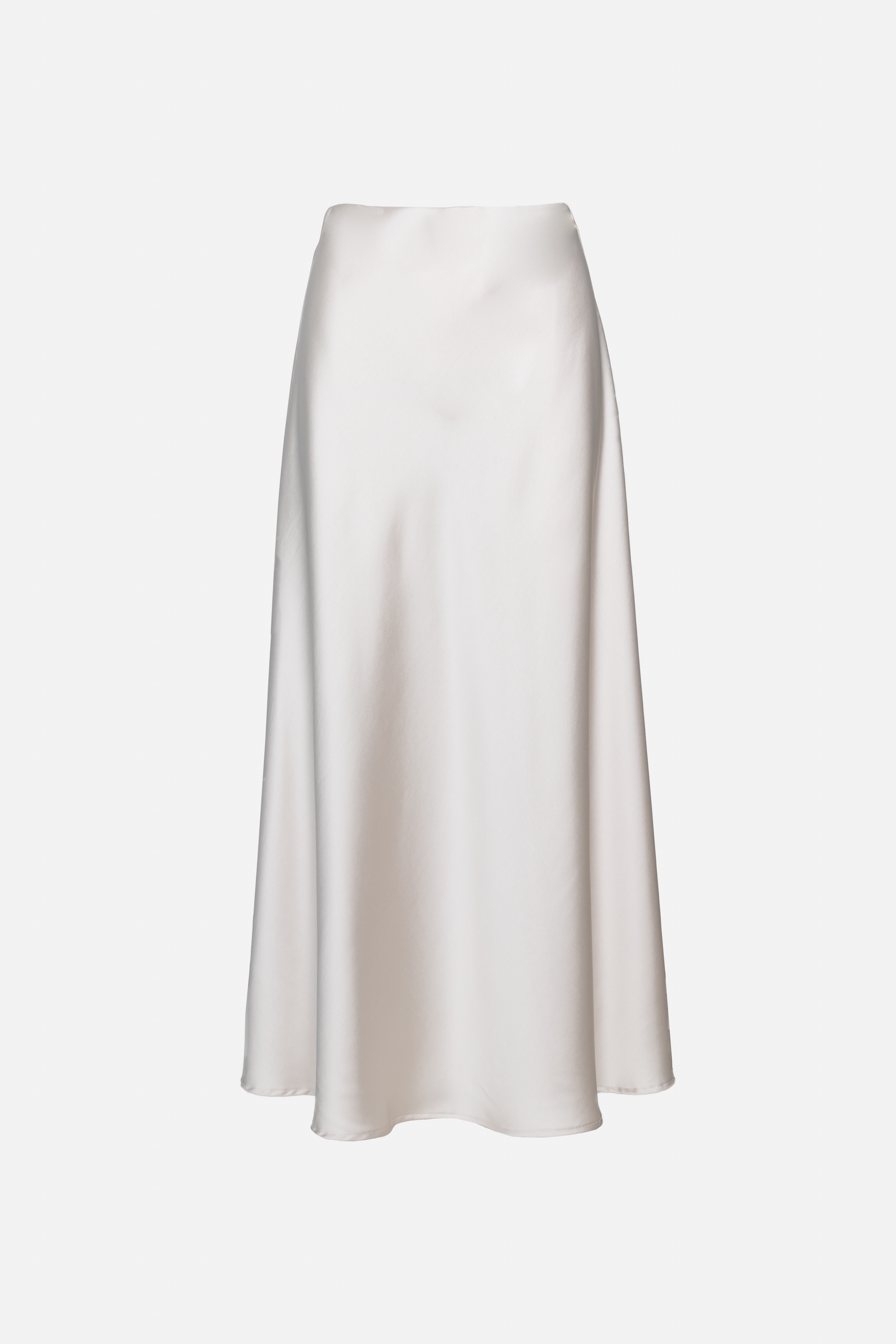 Η σατέν φούστα “Amara” φέρνει την αίσθηση της διαχρονικής κομψότητας με τη ρευστή της κίνηση και την πολυτελή λάμψη του υφάσματος. Ένα κομμάτι που αγκαλιάζει τη μέση και αφήνει το ύφασμα να πέσει φυσικά, χαρίζοντας θηλυκότητα και minimal γοητεία.